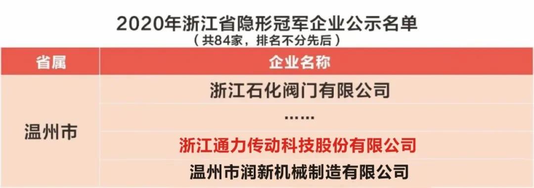 近日,浙江省經(jīng)信廳正式公布了2020年浙江省“隱形冠軍”企業(yè)名單,全省共有86家企業(yè)入圍,最終84家成功獲評,通力成功上榜“隱形冠軍”企業(yè)。